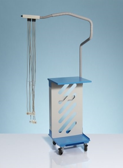 Il carrello è realizzato in acciaio, garantendo così robustezza e solidità. Nella parte posteriore del pannello si trova un vano per gli accessori di impiego quotidiano (carta, elettrodi, gel ecc) e per appoggiare le terminazioni del cavo paziente qualora si utilizzino elettrodi multiuso. Il carrello è verniciato con trattamenti idonei a renderlo particolarmente resistente al graffio e facile da pulire grazie all’assenza di spigoli morti inaccessibili.
